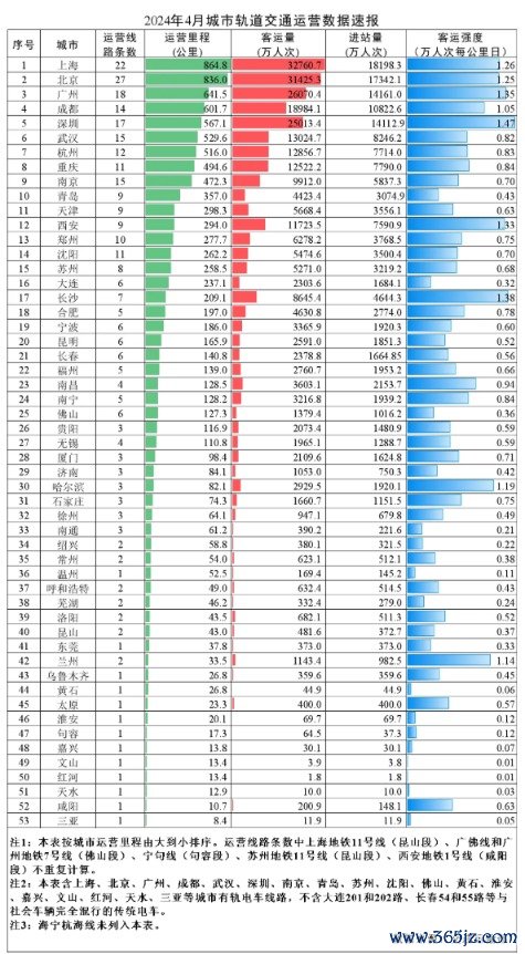 4月城市轨道交通数据出炉,谁的客运强度最大?